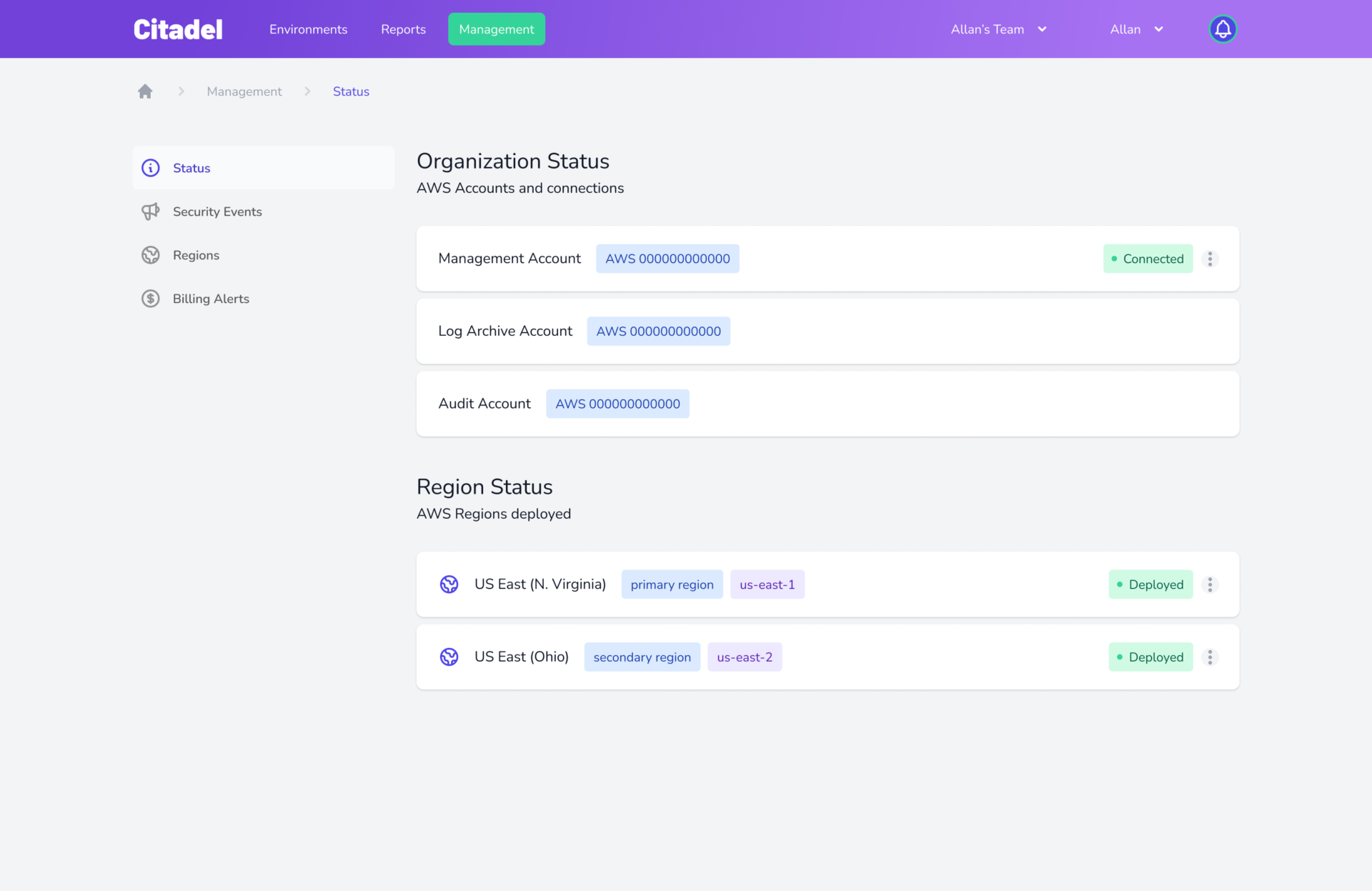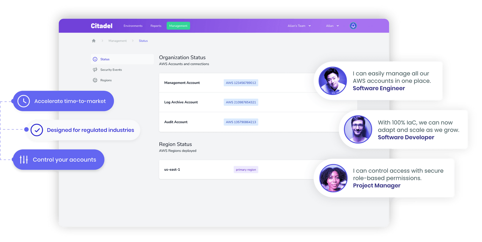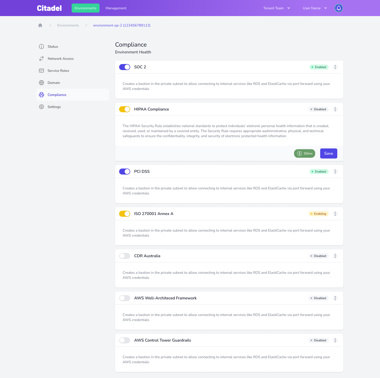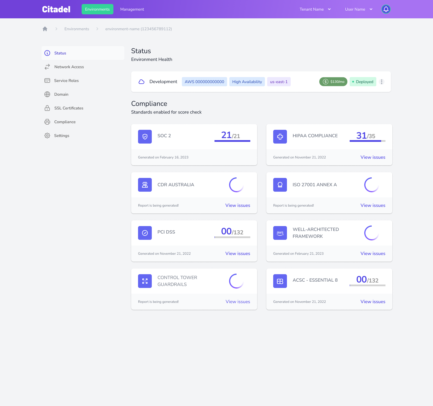 Citadel is a Software as a Service (SaaS) solution for managing your Amazon Web Services (AWS) cloud infrastructure. It allows customers to remove the complexity and easily create, manage and maintain resources whilst being audit-ready, highly secure and compliant with industry standards such as SOC 2, ISO 27001, HIPAA, PCI DSS, and CDR (Consumer Data Right).