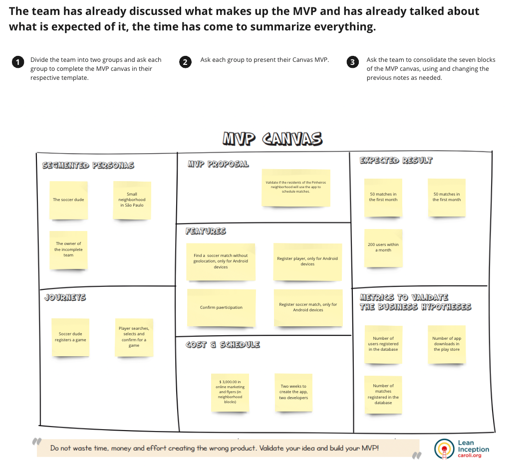 MVP Canvas is a visual chart that helps the team to align and define the MVP, the simplest version of the product that can be made available to the business (minimum product) and that can be effectively used and validated by the end user (viable product).