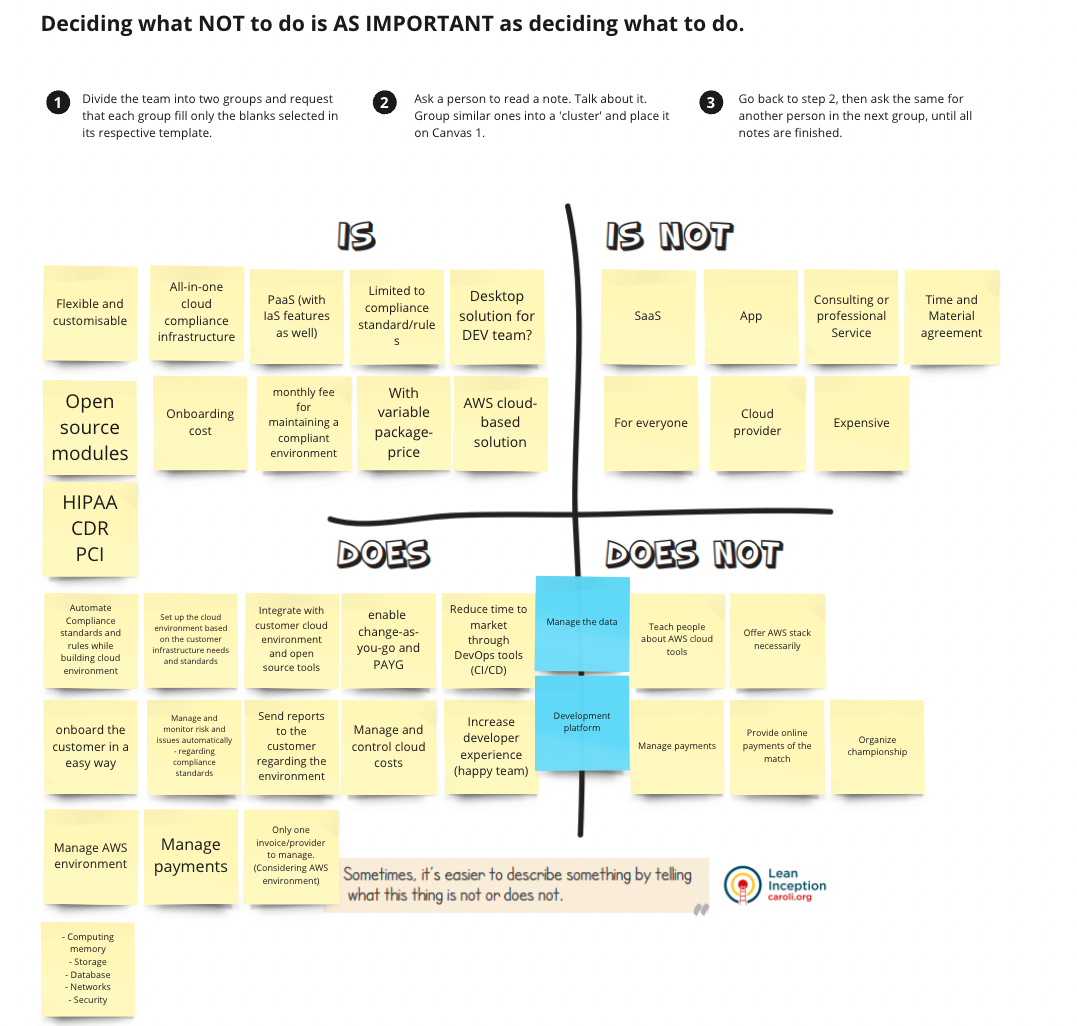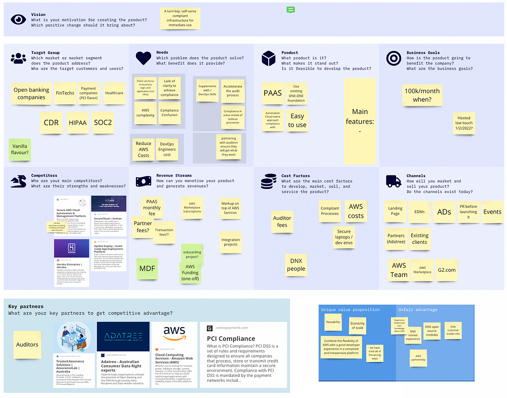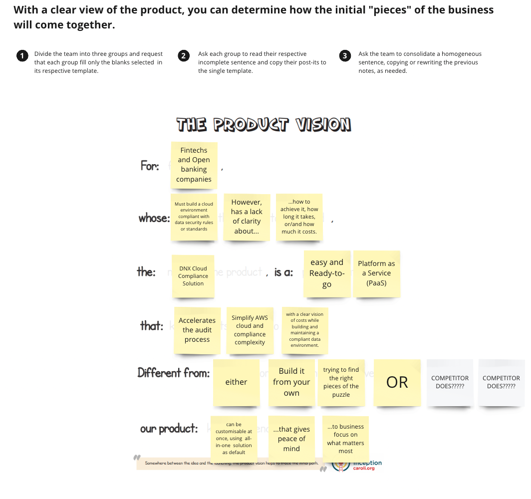 I like to consider a viable product something that makes economic sense, in other words, it needs to be profitable - at least based on Citadel goals. After analysing the potential of the market - more specifically FinTechs and HealTechs industries - I started provoking the team to build our Business Model as it pushes the team to think about things like value proposition, mission, competitors, goals, target, and so on. I also leveraged the opportunity with the team to create our Product Vision and the Product IS - IS NOT - DOES - DOES NOT DO canvas.