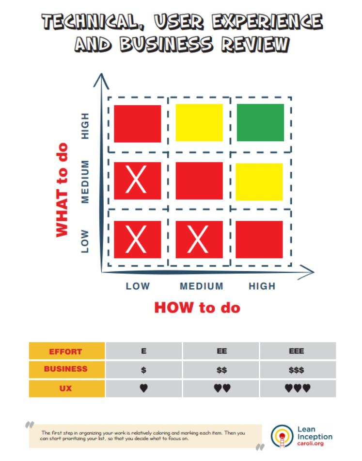 To achieve it, I suggested to the team to run a Lean Inception Workshop. It’s a one-week workshop focused on aligning people and building the right product or MVP, to be more specific it is the effective combination of Design Thinking and Lean StartUp to decide the Minimum Viable Product (MVP). It is a workshop divided into several steps and activities that will guide the team in building the ideal product.